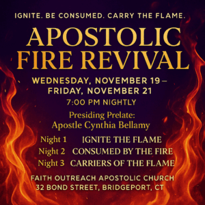 Faith Outreach Apostolic Church, 32 Bond St., Bridgeport CT 06610 @ 6pm.